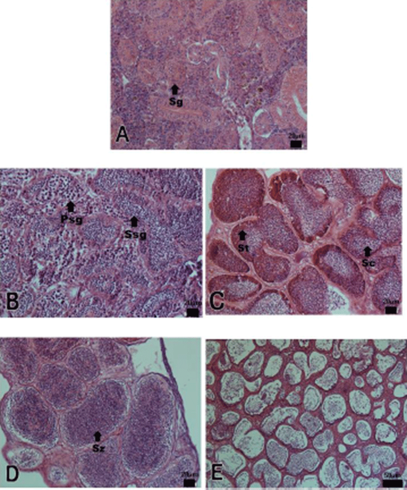 The progress of spermatogenesis stages were histological examined (Fig. 3), calculated as frequencies. The male reproductive cycle were classified as the growing, the mature, the ripe and releasing, the degenerative, and the resting phase (and Fig. 5).