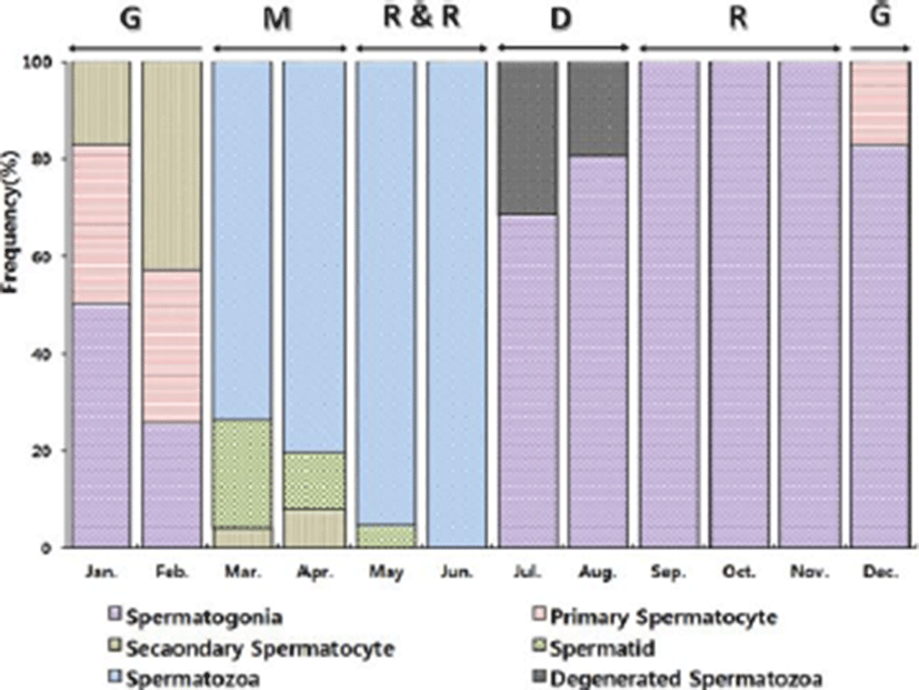 The ripe and releasing phase (seminiferous tubule of testes with spermatozoa) was from May to June. The degenerative phase was from July to August. A small number of sperm remained in the lumen of seminiferous tubules, after ejaculation. The resting phase (spermatogonia proliferation) was from September to November.