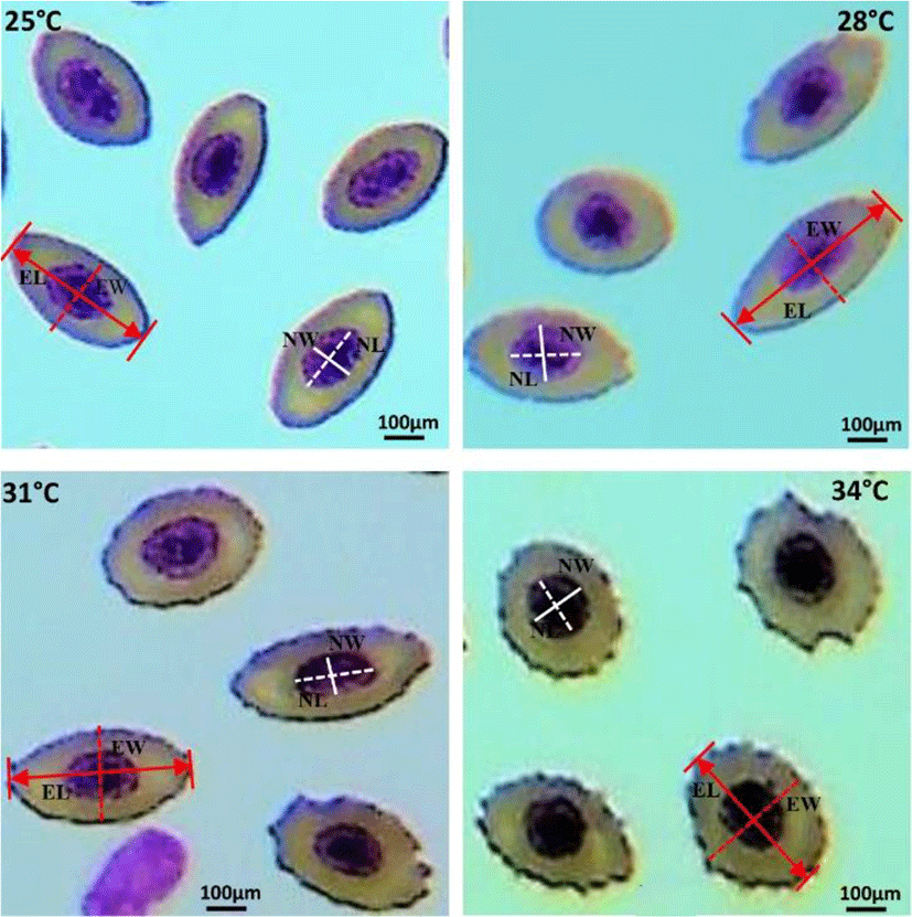 Elevated water temperature induced significant changes in erythrocytes and nucleus structure of 31°C and 34°C groups, compared to those in the 25°C and 28°C groups. Fishes of 31°C and 34°C groups showed round-shaped erythrocyte structure containing large nucleus, whereas erythrocytes of 25°C and 28°C groups showed oval-shaped structure with condensed nucleus (Fig. 1).