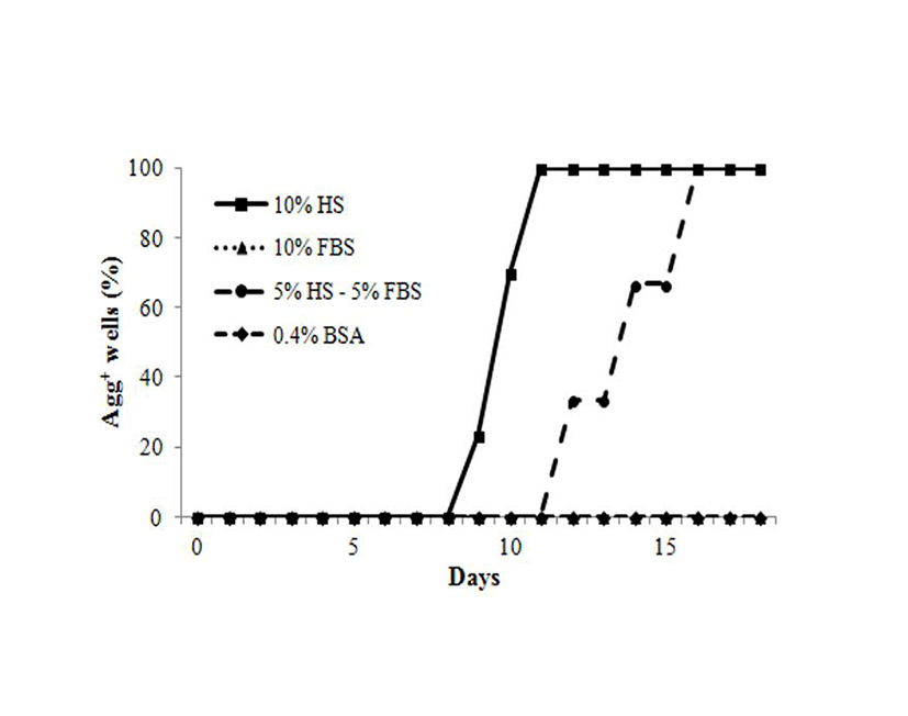 To examine whether all cells have the same response to HS different donor cells and other medium were tested. Aggregation was not observed in 10% FBS or 0.4% BSA-containing medium. However, 10% HS, and 5% HS plus 5% FBS induced aggregations of HEACs after 9 days of culture for HS and 12 days for 5% HS plus 5% FBS (Fig. 2). As early as 9 days following treatment, HEACs started moving to several-specific spots and formed aggregations. Between 9 and 11 days aggregates were observed responded to HS. In the other hands, less HS plus FBS-containing medium also induced aggregation, but starting date was delayed from 9-day to 12-day. These results are showing that HS might act as activator and FBS might act as an inhibitor.