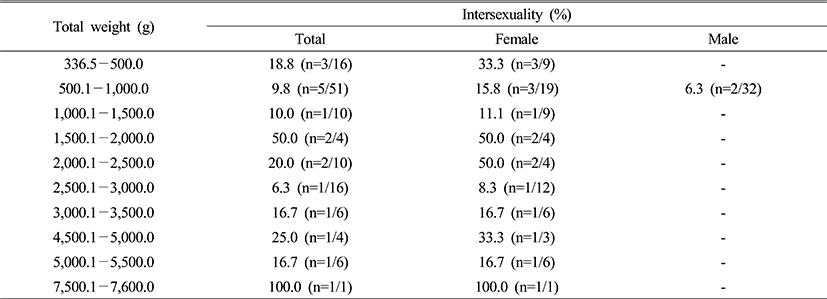 Collected specimens were measured and classified every 10.0 cm for the total length and 500.0 g for the total weight. Intersexuality in accordance with the total length and weight did not display apparent correlation (Table 3 and 4).