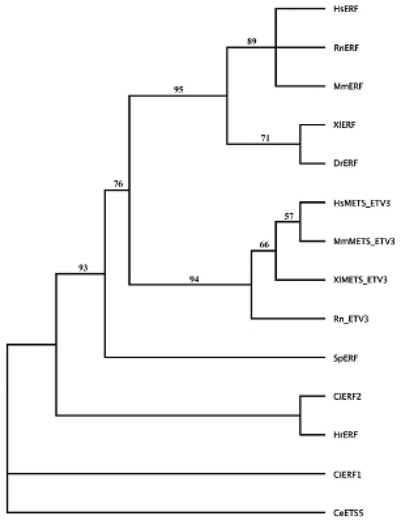 A cDNA fragment for Erf homolog was found in clones of the database of maternal mRNA of H. roretzi eggs, MAGEST (Kawashima et al., 2000; Lee et al., 2011). In order to obtain a full-length H. roretzi Erf cDNA, the first strand cDNA was synthesized from extracted mRNA using SMART RACE cDNA synthesis kit (Clontech). The Erf homologue was named Hr-Erf (H. roretzi Erf). The amino acid sequences of Erf gene products were aligned on the basis of maximum similarity using Clustal W program. Molecular phylogenetic relationships among the Erf and Mets/Etv gene products were estimated using the neighbor-joining method (Saitou & Nei, 1987). Sequence data used in this study were taken from GenBank/EMBL/NCBI databases, with following accession numbers: CiERF1, Ciona intestinalis ERF1 (XP002124625); CiERF2, Ciona intestinalis ERF2 (NP001071696); DrERF, Danio rerio ERF (NP001038392); HsERF, Homo sapiens ERF/PE2 (NP006485); MmERF, Mus musculus ERF (NP034285); RnERF, Rattus norvegicus ERF (NP001163806); XlERF, Xenopus laevis ERF (NP001089722); SpERF, Strongylocentrotus purpuratus ERF (XP800545); HsMETS, Homo sapiens METS/ETV3/PE1 (NP001138784); MmMETS, Mus musculus METS/Etv3/PE1 (NP001076787); RnETV, Rattus norvegicus ETV3 (NP001099920); XlMETS, Xenopus laevis METS/ETV3 (NP001088435); CeETS5, Caenorhabditis elegans ETS5 (NP508865).