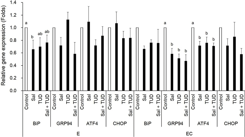 In the E group, there were no significant differences in the transcription levels of apoptotic genes (Bax and caspase-3) among treatments (Fig. 3). In the EC group, however, both apoptotic genes were reduced by ER stress inhibitor treatments compared to control (p<0.05) except Caspase-3 gene by TUDCA treatment.